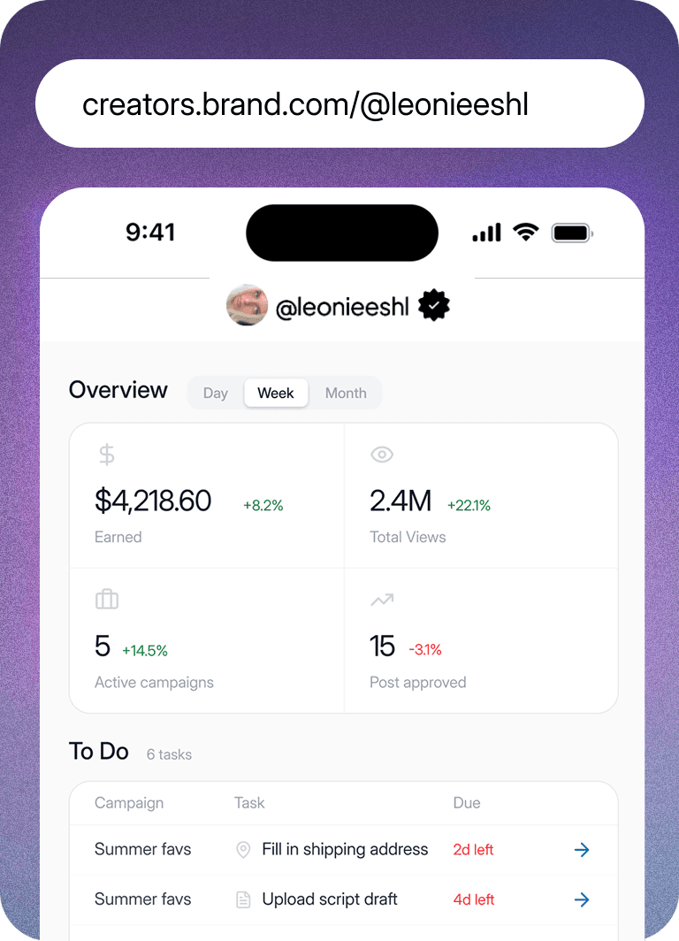 A branded portal on your own domain name where creators can build product storefronts, join UGC and social campaigns, and get paid in minutes.