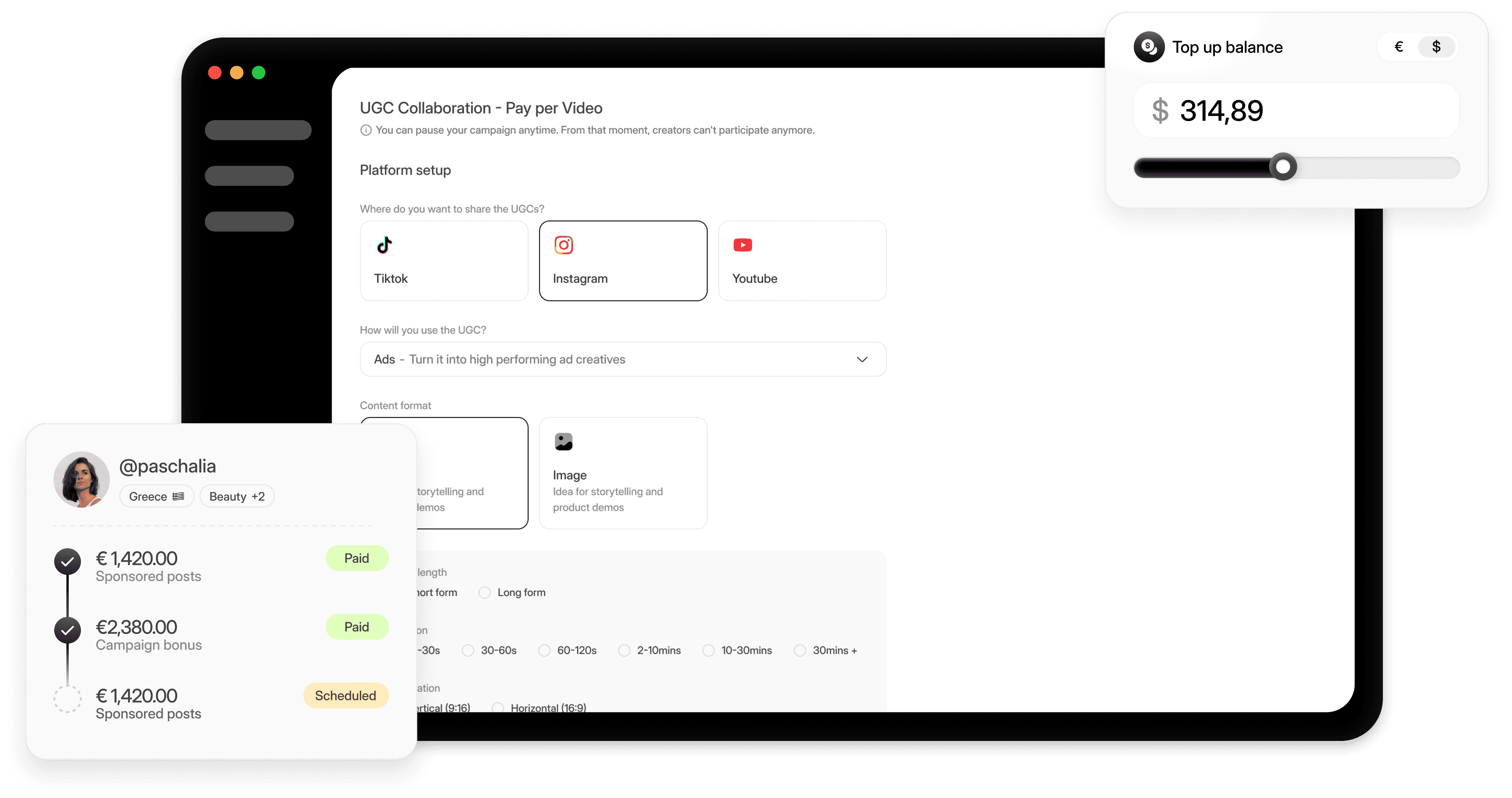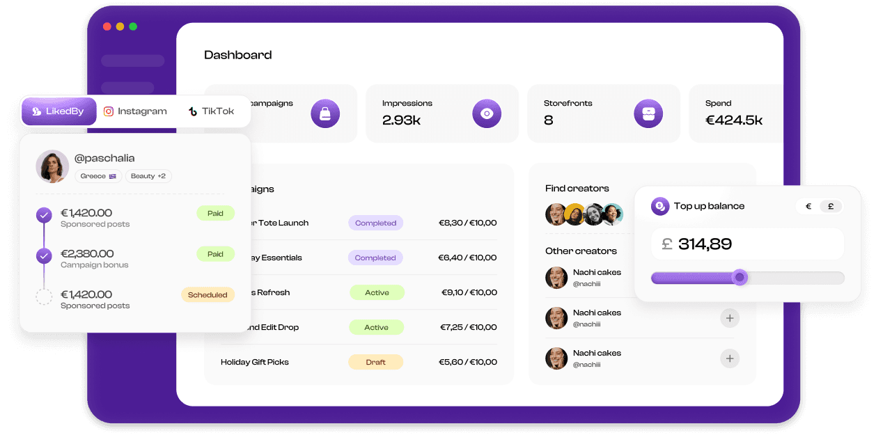 Pay creators for views, clicks or sales they generate, so you're fully in control on how you compensate them. For example; pay them for views, clicks or sales.