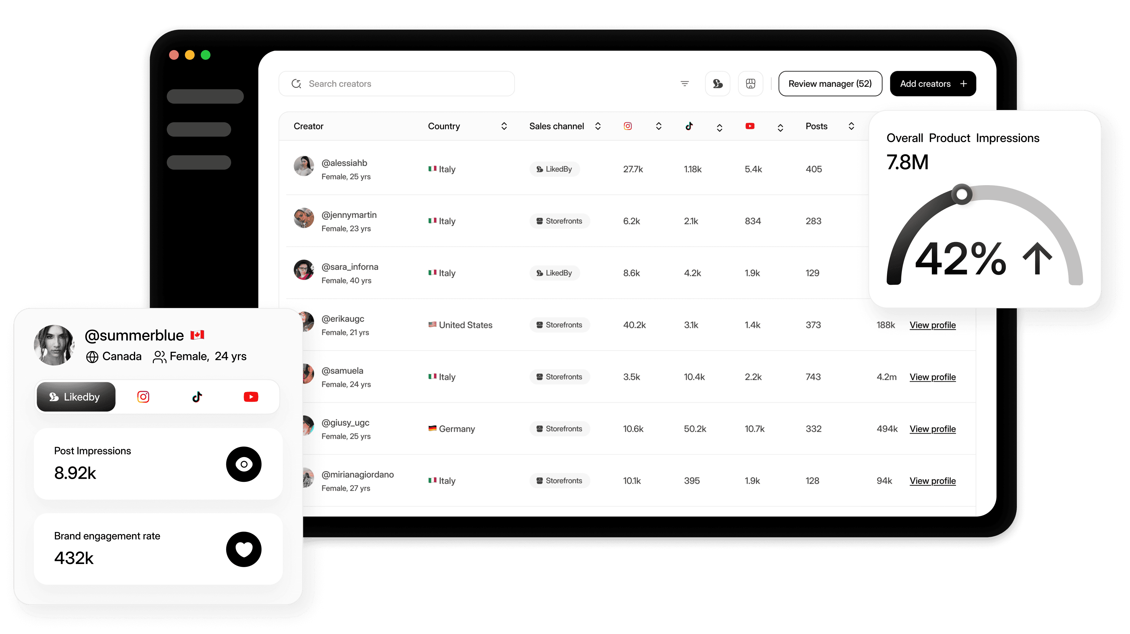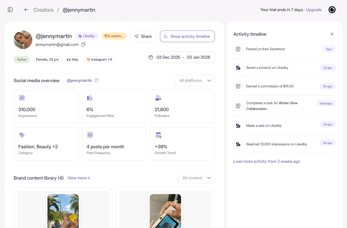 Full understanding how creators behave beyond your store, and get insights on how active creators are, what their growth is, and from what channels traffic comes to your store.
