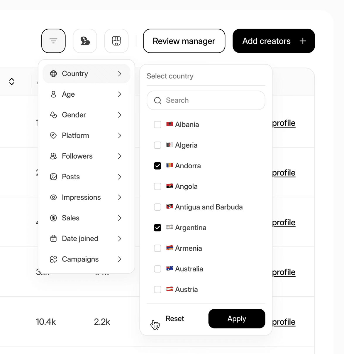 Filter and organize creators by the attributes that matter to your campaigns and activities.